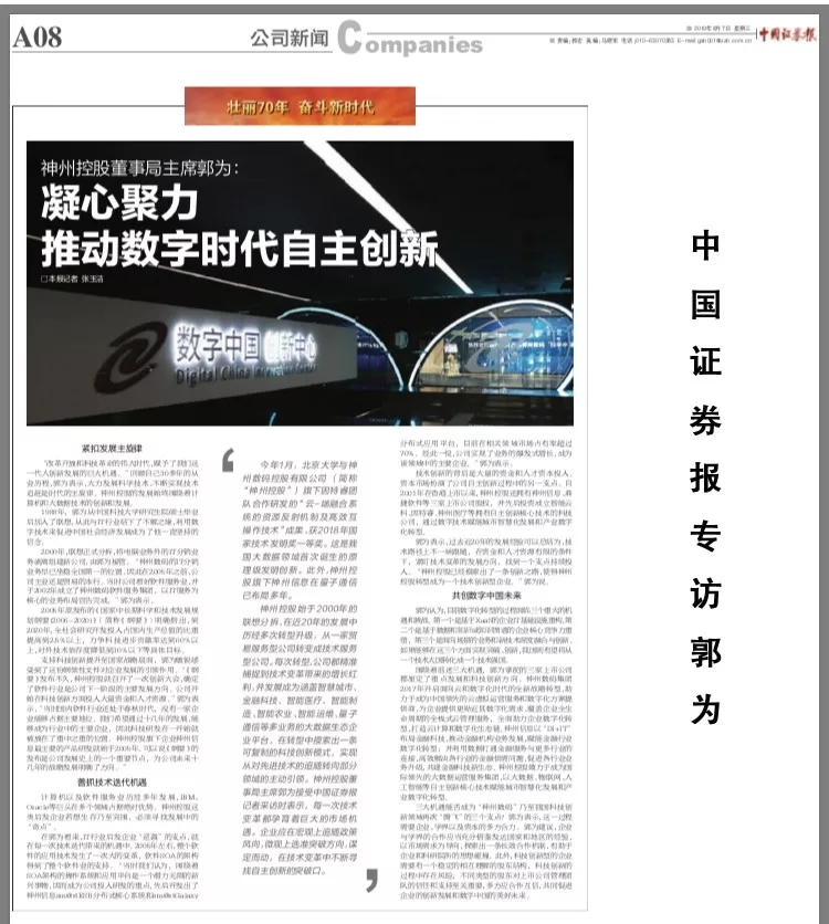 70年砥砺奋进,70年谱写辉煌。2019年,迎来新中国成立70周年。为充分展现中华人民共和国成立70年来的光辉历程,展示中国经济建设的伟大成就,以及中国资本市场的长足进步,《中国证券报》推出“庆祝新中国成立70周年”专题报道,讲述经济发展的中国故事,勾勒证券市场前进足迹,同庆70华诞,同享伟大荣光,同铸复兴伟业。作为数字中国的践行者,神州控股董事局主席、神州信息董事长郭为近期接受了《中国证券报》专访,以下为详细内容: