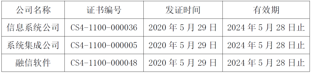 近日,信息系统公司、系统集成公司、融信软件分别收到由中国电子信息行业联合会颁发的《信息系统建设和服务能力等级证书》,经评估,信息系统公司、系统集成公司、融信软件均符合《信息系统建设和服务能力评估体系能力要求》,能力达到优秀级(CS4级),证书信息如下: